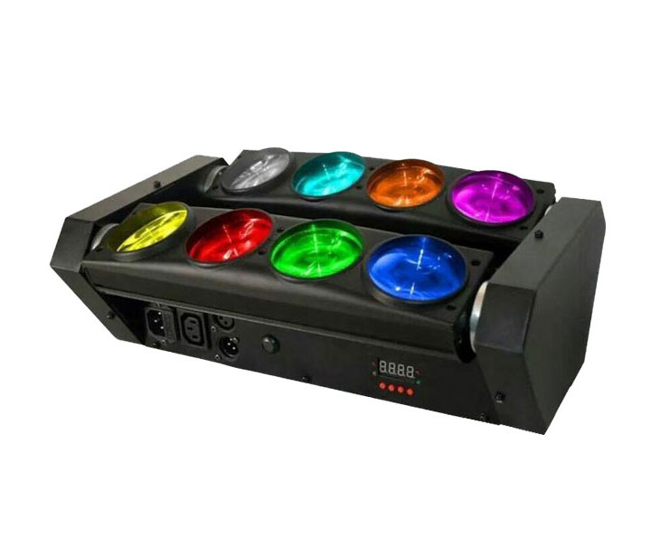 led8眼蜘蛛燈8眼光束燈酒吧效果燈 1.電壓:AC100-240V,50/60HZ 2.功率:150W 3.光源:8*10W LED進口燈珠 4.顏色:白色/四合一 5.控制:DMX,主從,聲控,自動模式。 6.調光:0-100% 7.顯示:液晶顯示屏 8.通道:6CHS/12CH 9.掃描角度:垂直180 10.發(fā)光角度:4.5度 11 .重量:5.5KG 12.外箱尺寸:395*240*180m